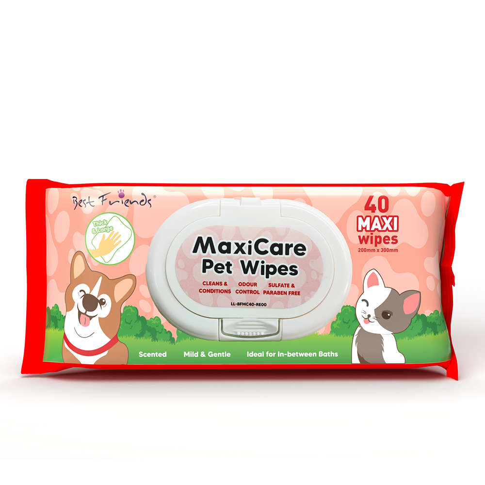 Best Friends Maxicare Pet Wipes provides a mild and gentle cleansing formula that keeps your pets clean everyday. Enriched with Vitamin E and Aloe Vera extract to moisturise pet's skin and maintain coat softness. Suitable to use in between baths and serves as an alternative to pets who are resistant to bathing.