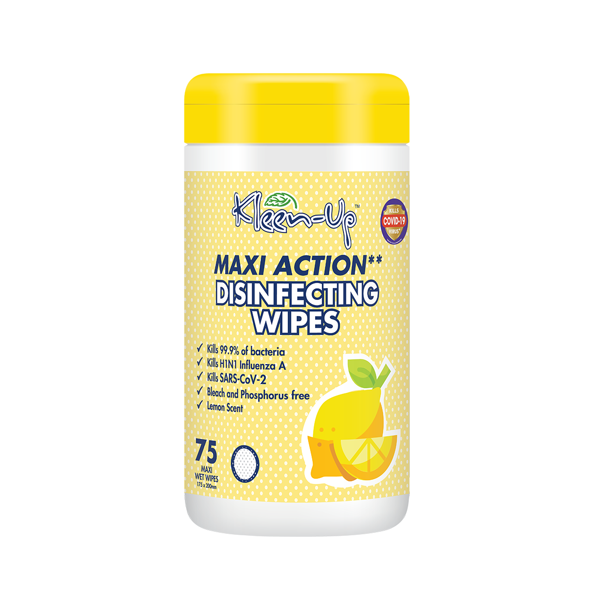 Khăn lau khử trùng Kleen-Up Maxi Action** nhanh chóng và hiệu quả trong việc vệ sinh và khử trùng bề mặt tại nhà và nơi công cộng. Diệt 99,9% vi khuẩn trong một phút! Luôn bảo vệ bạn và gia đình. Khăn lau chứa công thức Vitamin E và Lô hội để chăm sóc làn da mỏng manh của bạn. Khăn lau có kết cấu dạng lưới cung cấp khả năng làm sạch tối đa, giữ lại 30% bụi bẩn, đất, bụi và tóc.